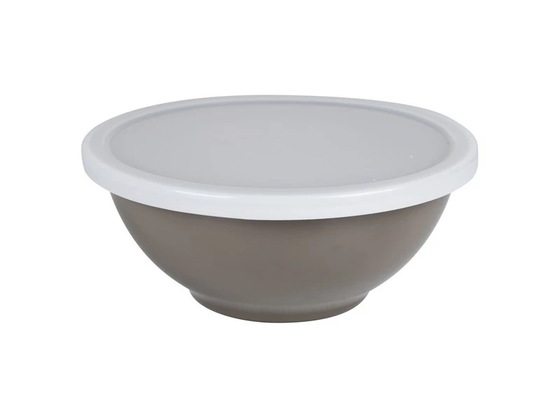 Een ronde kom met deksel. De kom is gemaakt van 100% melamine en heeft een kunststof deksel. Deze hoogwaardige melamine kom is vrijwel onbreekbaar en zeer licht van gewicht. Daarnaast is de kom kraswerend en vaatwasmachinebestendig.