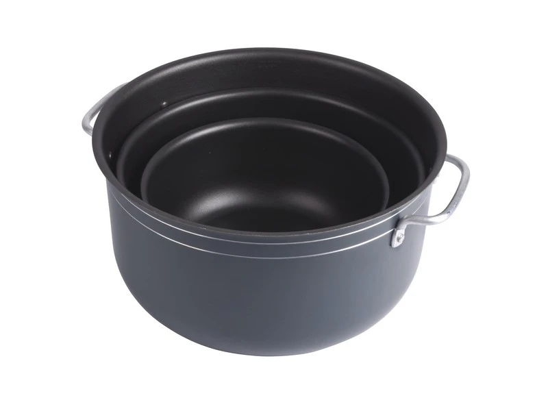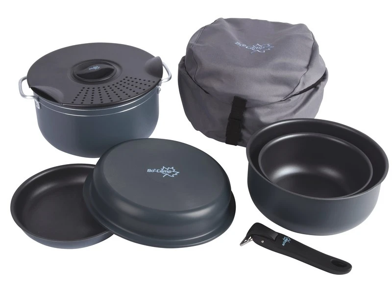 Een complete en zeer compacte 7-delige pannenset. Alle pannen uit deze set zijn voorzien van een poedercoating aan de buitenkant en een anti-aanbaklaag aan de binnenkant. Door het gebruik van aluminium is deze kookset zeer licht van gewicht. Deze aluminium pannen zijn te gebruiken op de warmtebronnen gas, keramisch en elektrisch. Deze pannenset bestaat uit 3 kookpannen, 2 koekenpannen, een afgietdeksel en een pannengreep. De meegeleverde beschermhoes zorgt dat de volledige set compact kan worden opgeborgen. Afmetingen kookpannen (Øxh): 23×12, 21×8 en 17×7 cm. Afmetingen koekenpannen (Øxh): 24×4,5 en 18,5×3 cm. Afmetingen genest (Øxh): 24×16 cm. Inhoud: 1,4, 2,5 en 4,4 liter.