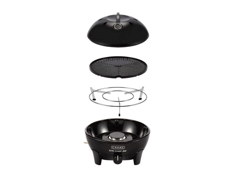 De Citi Chef 40 wordt geleverd inclusief een pandrager, een BBQ rooster en een deksel met thermometer.