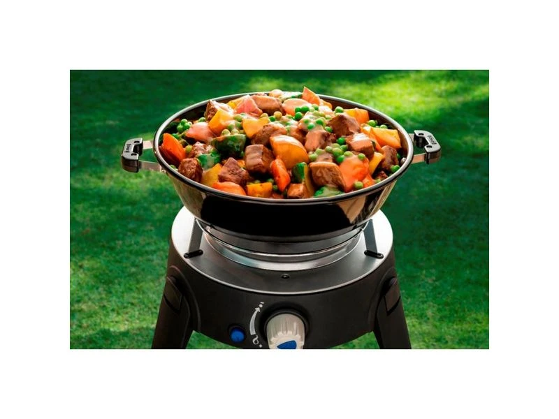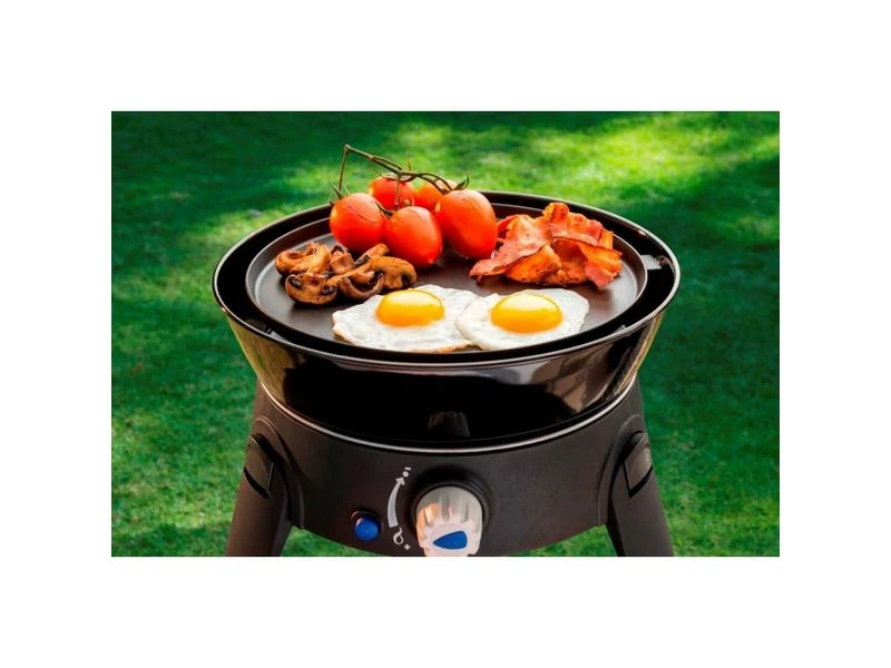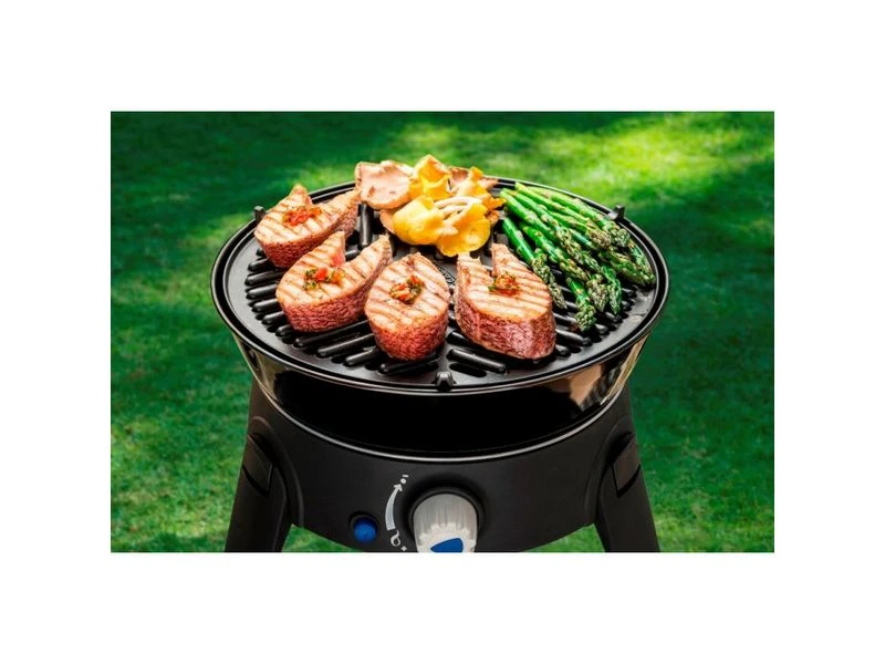Deze draagbare, veelzijdige gasbarbecue weegt minder dan 4 kg en heeft maar liefst vier verschillende kookoppervlakken; een brander met pandrager, een BBQ rooster, een bakplaat en een deksel (ook als soeppan te gebruiken).