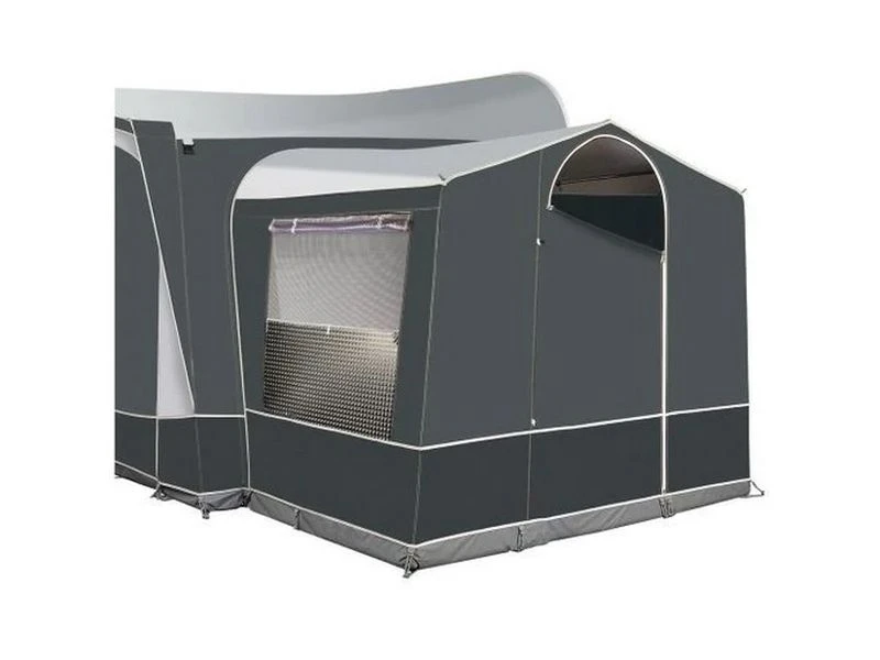 Uitgevoerd in dezelfde kleurstelling als de caravan voortent, namelijk antraciet/grijs, en standaard geleverd met een 25 mm stalen frame voor de uitbouw. Optioneel ook verkrijgbaar met een lichtgewicht ALU frame. Mogelijk nog uit te breiden met de universele Doréma binnentent voor de uitbouw.