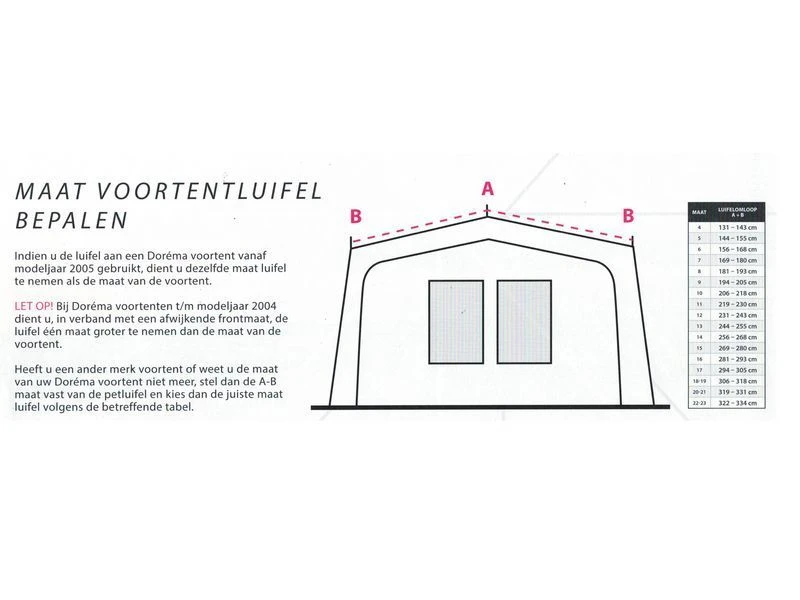 Maat = in cm. van tot = Luifelmaat A+B
