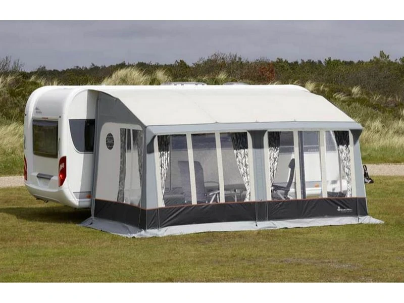 De twee meegeleverde steunstangen duwen de vastgenaaide sluitkussens stevig vast tegen de caravan voor een optimale afdichting. De Universal 420 heeft een deur in de beide zijwanden en grote vensters in het hele front die voor een goed uitzicht zorgen.