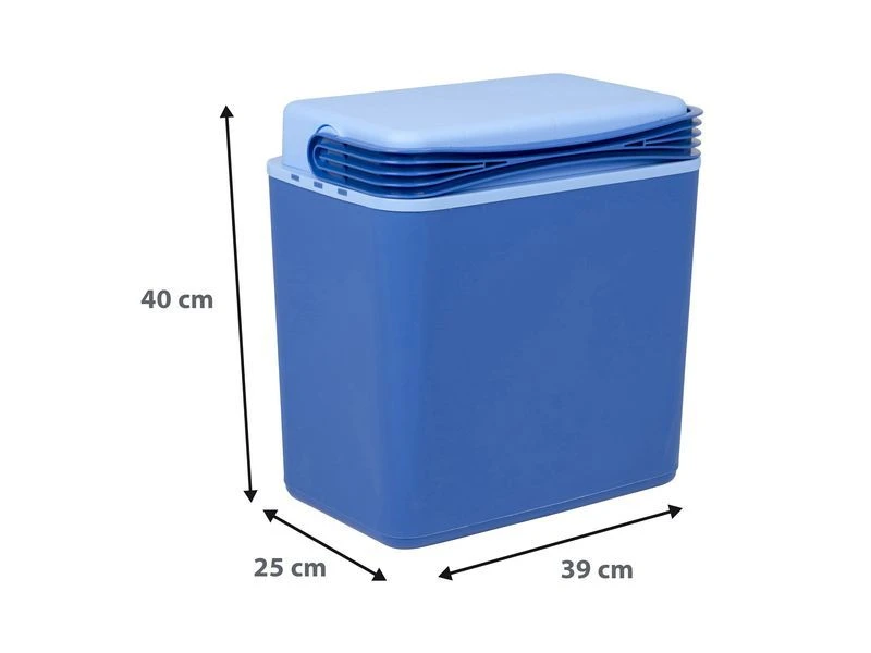 Een handzame koelbox met een inhoud van 24 liter. Met het handvat wordt het deksel geblokkeerd om de koelbox af te sluiten.