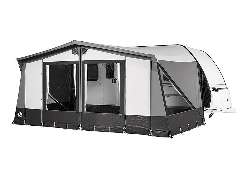 Met de Orion heb je alles in één; een heerlijke voortent, die geheel gesloten voldoende ruimte biedt om met het hele gezin comfortabel te eten of te relaxen. De grote ramen aan de voorzijde zijn voorzien van strakke witte gordijnen aan een ingestikte rails. Met onze verandastang creëer je in een handomdraai een heerlijke groot raam.
