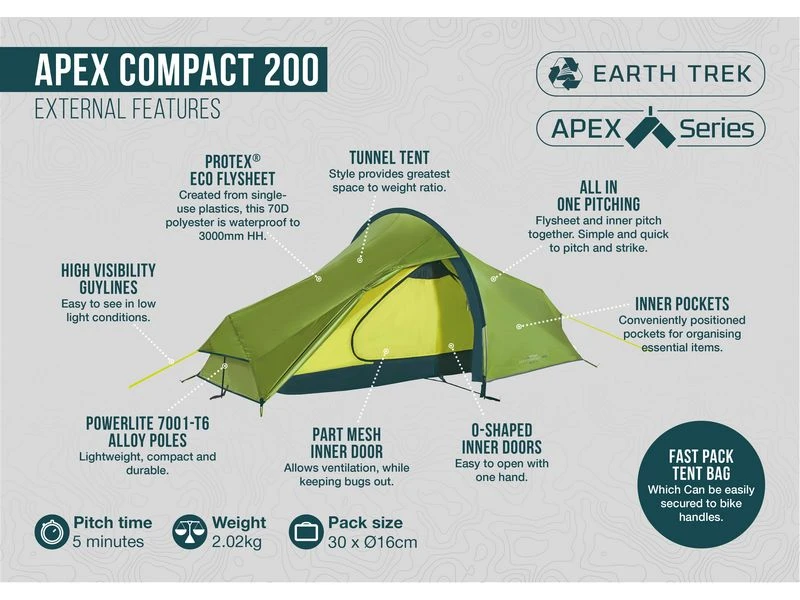 Maak kennis met onze opwindende, lichtgewicht en innovatieve Apex-serie, ontworpen voor avonturiers die een compacte, hoogwaardige, lichtgewicht tent nodig hebben. Als onderdeel van onze Earth Collection is de Apex gemaakt van 70D Protex® Eco-stof, gemaakt van gerecycled plastic voor eenmalig gebruik. Uniek aan Apex zijn de 30 cm lange stoksecties die hem ideaal maken om licht mee te nemen op elk avontuur, van bergbeklimmen, wandelen en Duke of Edinburgh’s Award-activiteiten tot het inpakken van fietsen, omdat het unieke ontwerp van de rugzak aan het fietsstuur kan worden bevestigd. De Apex maakt uitstekend gebruik van uw beschikbare ruimte en heeft nog een aantal andere kenmerken, zoals sterke PoweLite Alloy-palen, gedeeltelijk gaasdeuren voor ventilatie in de zomer of voor gebruik in het buitenland en O-vormige deuren die het gemakkelijk maken om met één hand te openen en deze ook omlijsten. keer bekeken.