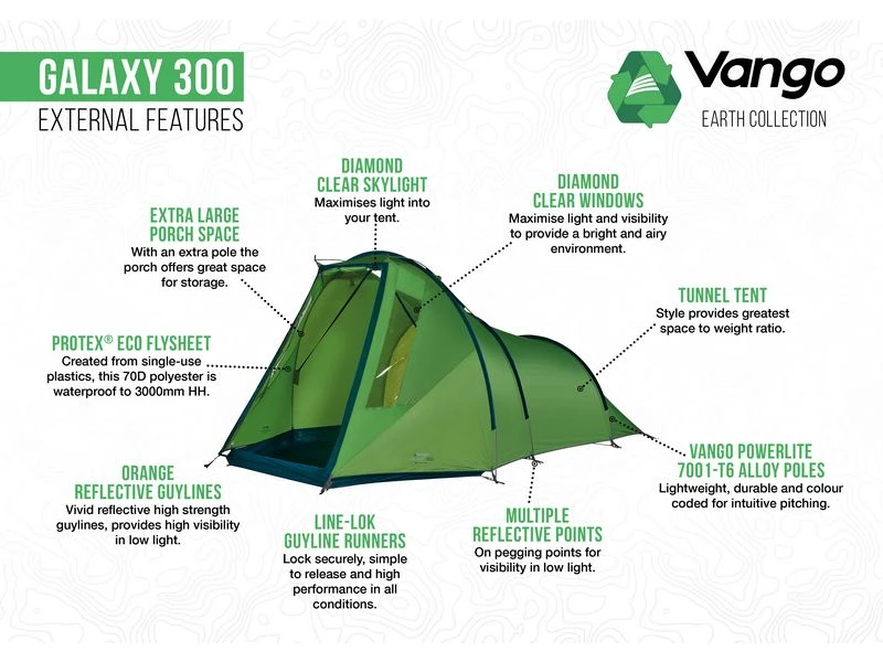 De Galaxy is een makkelijk op te zetten, lichtgewicht tunneltent met ingang op stahoogte. Door zijn ruimte ideaal voor mensen die veel spullen meenemen of veel bewegingsruimte willen. Door het grondzeil aan de opening vast te klikken, wordt de leefruimte vergroot. Ook handig voor opslag.